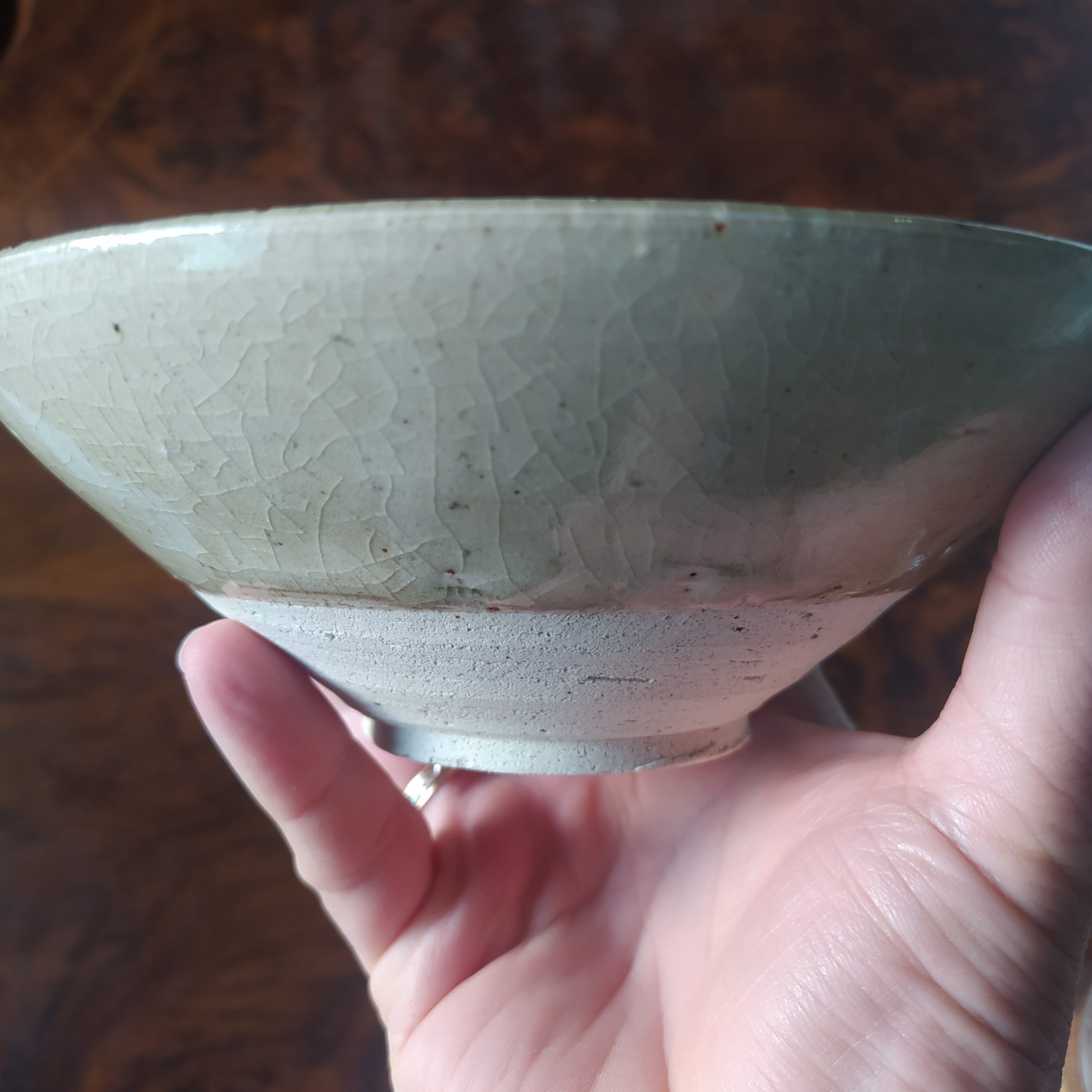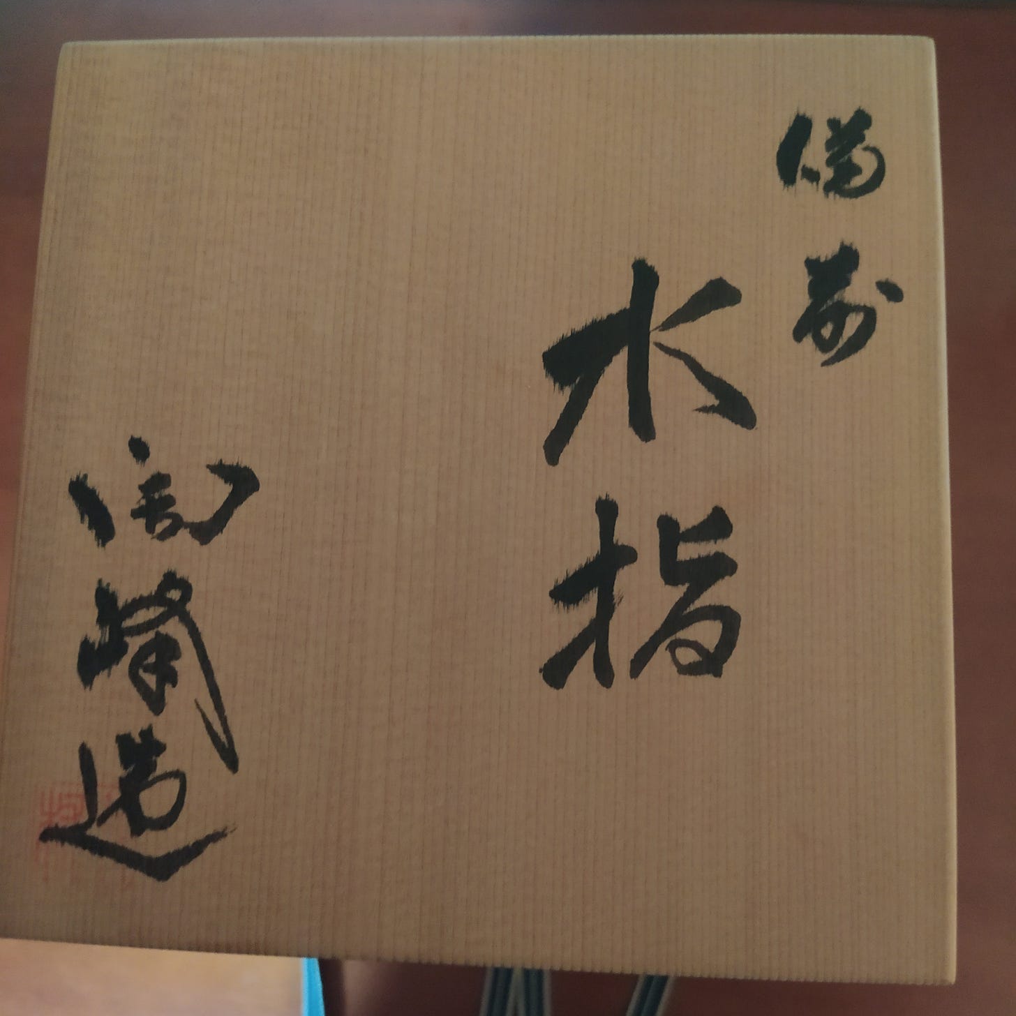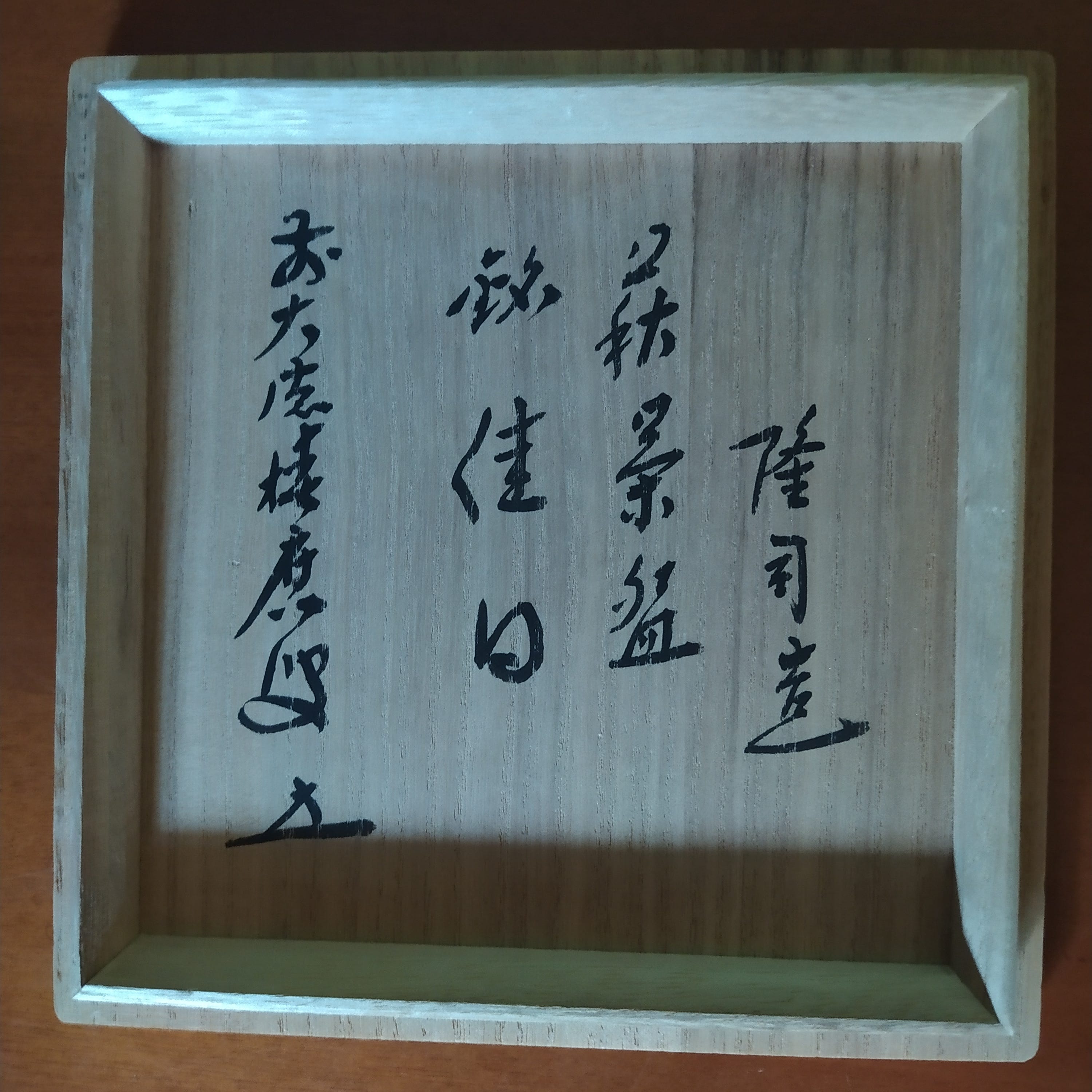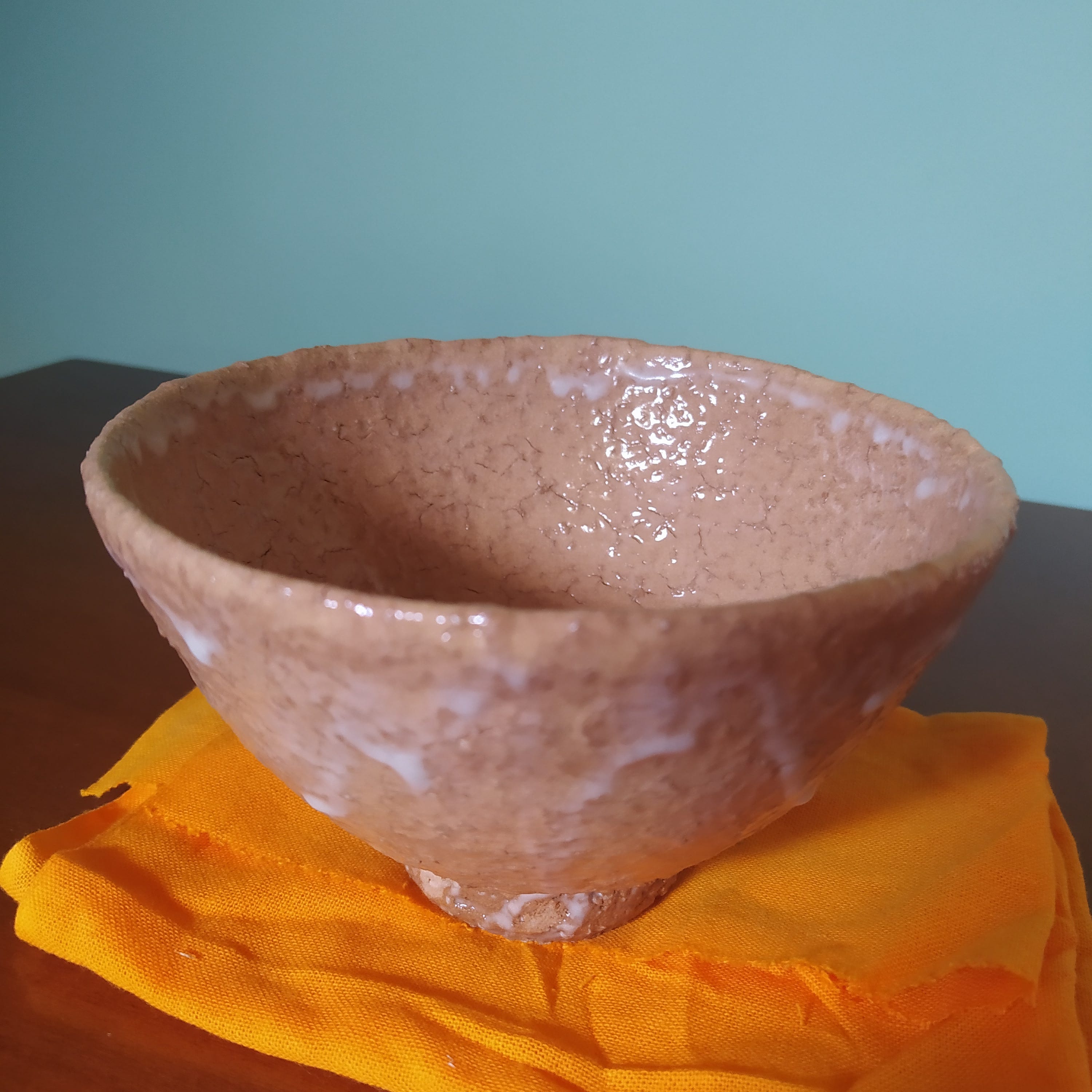 This is a chawan, ideally suited for usucha (thin tea). It is an example of Hagi-yaki pottery, the traditional ware of Yamaguchi prefecture since feudal times, when most of it was ruled by the Mori clan from their seat in the town of Hagi. It presents the Korean-borrowed Oido (‘big well’) shape, biwa glaze and sugary white slip. It was made by Takashi Mashita and contained in a box signed by Zen Master Sekio Fukumoto. I got it fom a seller in Hofu.