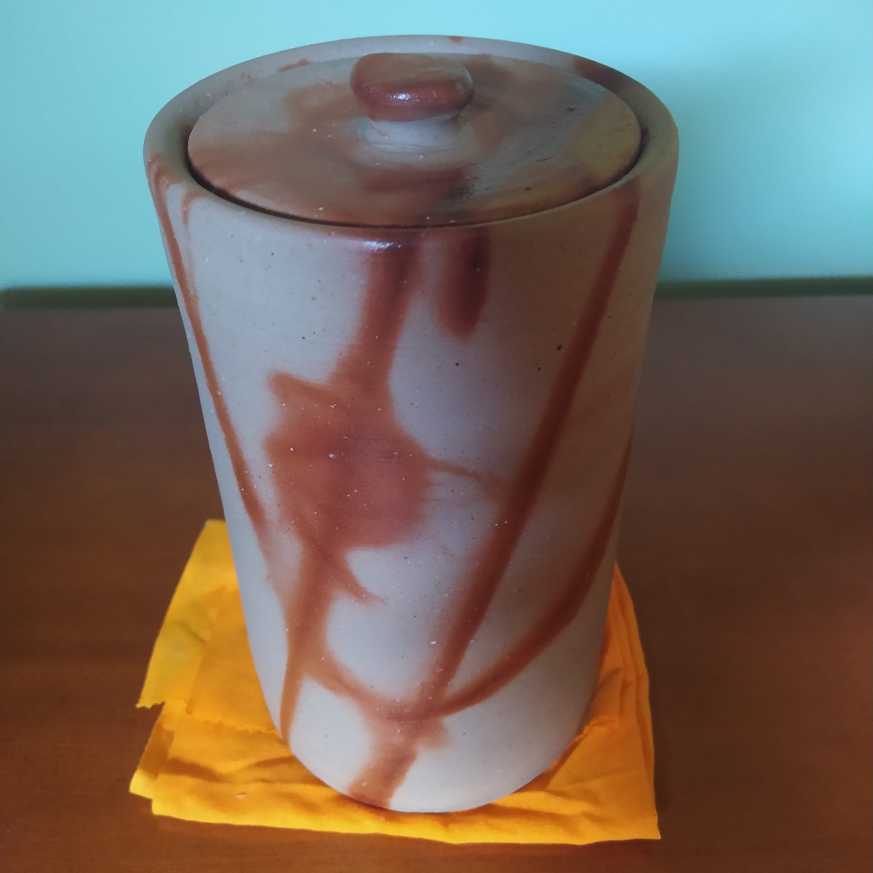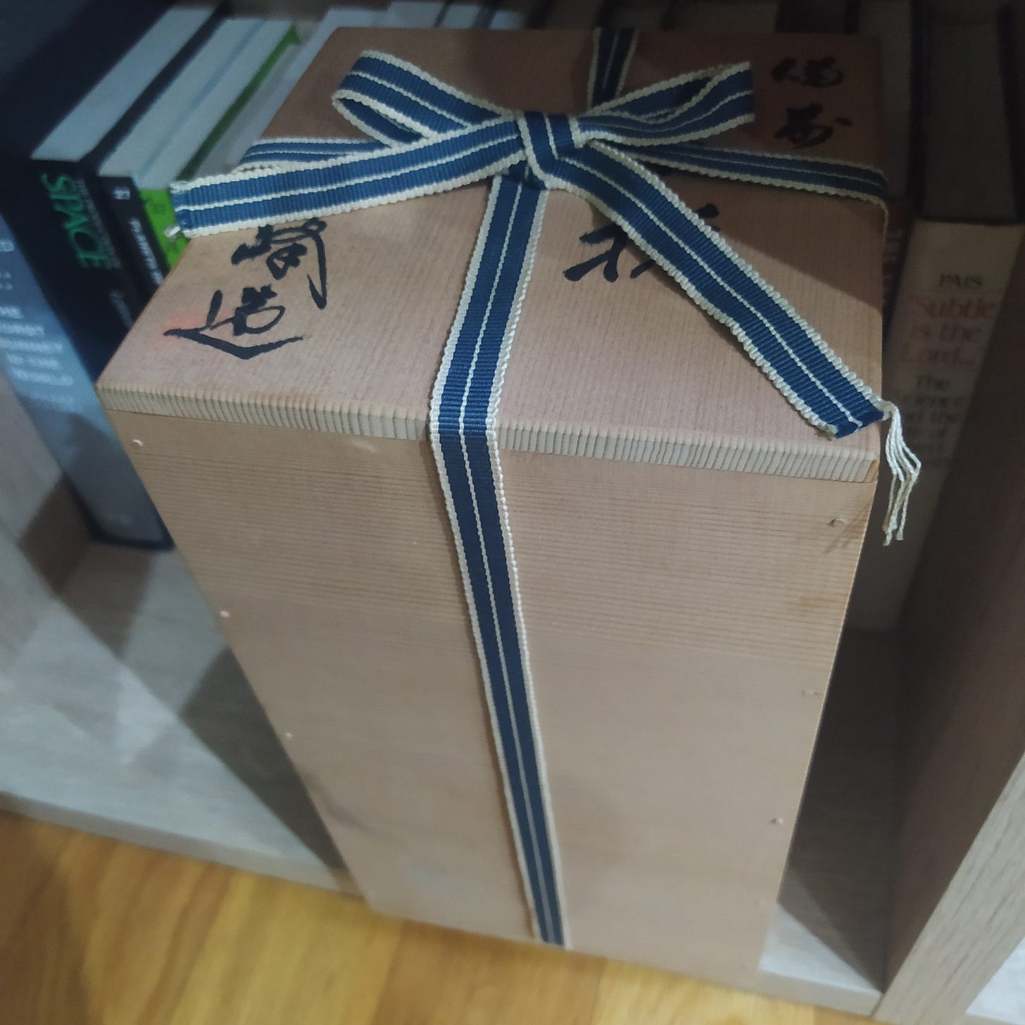 This is a mizusashi, the cold water contained that is used to refill the kama (kettle) during chanoyu. It’s a very good example of Bizen-yaki, the traditional ware of Okayama prefecture, made around 40-50 years ago by noted potter, Kimura Toho. Bizen-yaki is a really ancient pottery - one of the ‘six ancient kilns of Japan- and characterized by a robust, no-nonsense, unadorned simplicity which highlights the iron-rich local clay which accepts of no glazing. Instead, similar effects are produced in the kiln by ash melting or, in this case, by employing the hidasuki technique, in which the piece is placed in a box and wrapped in straw which, when consumed, generates the flame-like images on the vessel.